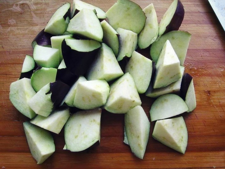 1、茄子洗干净,掐头去尾,顺茬破开,再顺茬破开,抹斜切,切成三角块;
