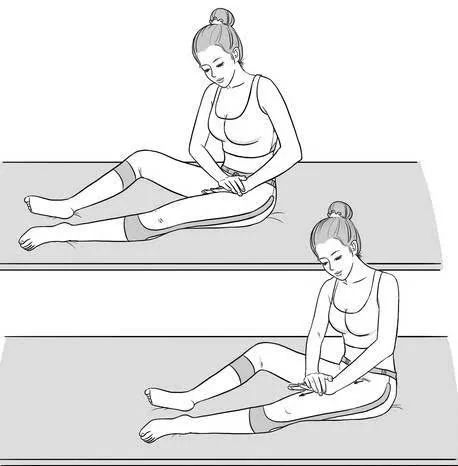 坐在床上,右腿向前伸直,左腿弯曲平放,双手交叠,压在大腿根部,沿着大腿内侧肝经的位置,稍用力向前推到膝关节的,反复推动,四五十遍,然后换另一只腿同样的手法。