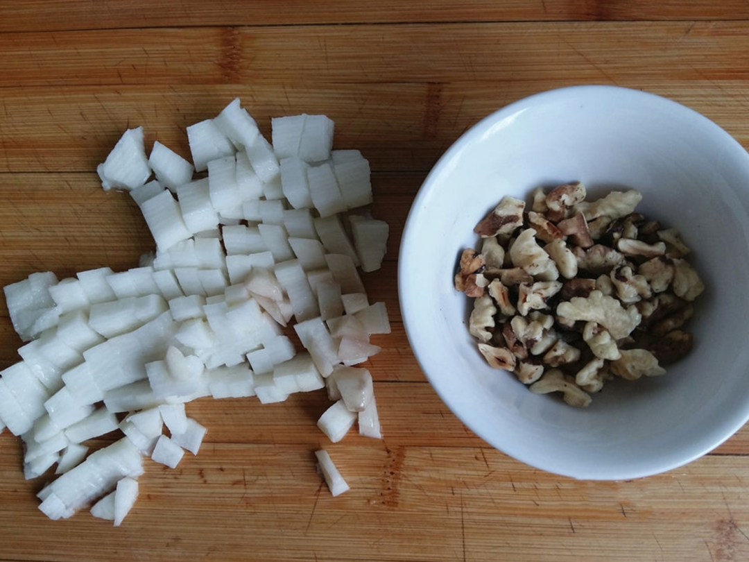 2、核桃去皮(不去皮也可以),用擀面杖轻压成小块,放入山药中一起放入锅里,开锅即可;