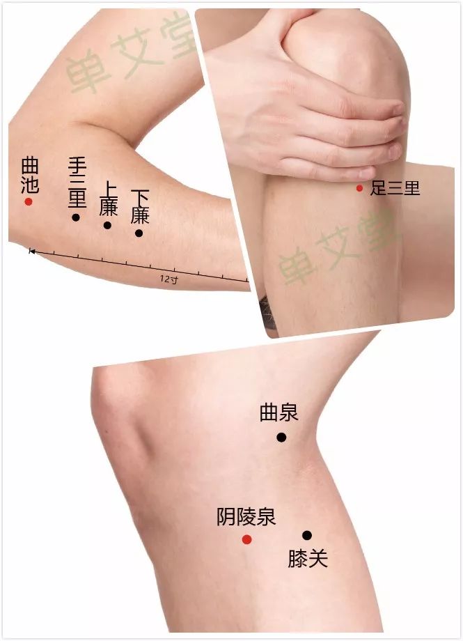 艾灸取穴:阿是穴;足三里、阴陵泉、曲池,双侧