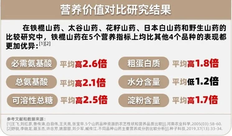 经过营养价值对比研究结果,温县铁棍山药的在5个营养指标上,比其它品种高出数倍。