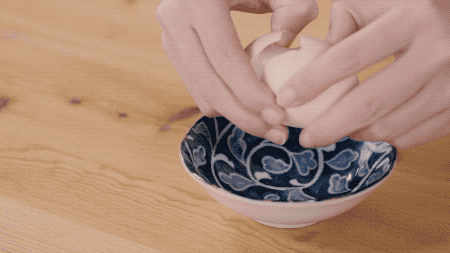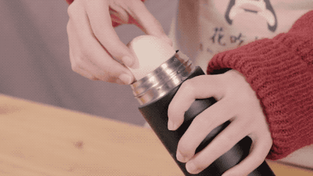 ▼ 1. 制作温泉蛋:保温杯倾斜一点,放入鸡蛋再倒入大约70度的热水,盖上盖子焖30分钟。