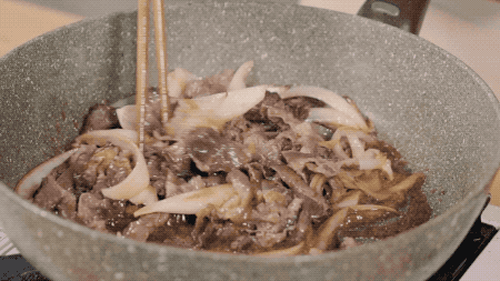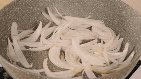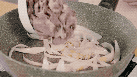 ▼ 4. 炒肥牛:锅中倒油,放入洋葱炒香炒软。