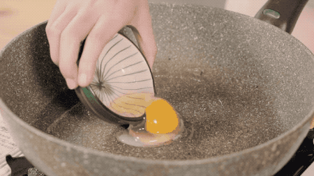 ▼ 4.煎太阳蛋:平底锅倒油,油热后敲入鸡蛋。蛋白定型后,放一勺冷水,加盖子闷1分半钟。
