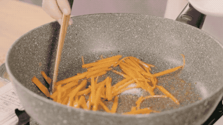 ▼ 2.炒蔬菜:平底锅倒油,把处理好的菠菜、胡萝卜、香菇片和金针菇分别炒熟,加一点盐调味。