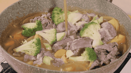 加入西兰花和肥牛卷,淋一点牛奶提味,再煮5分钟左右,浓郁的咖喱就做好啦。