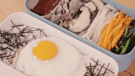 吃的时候把一顿乱拌,把所有食材都混在一起,浓郁的蛋黄流淌在红艳艳的韩式拌饭上,甜甜辣辣又软软嫩嫩。
