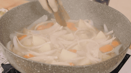 炒出香味后倒入半锅子水,煮开后加入咖喱块,盖上盖子中火煮10分钟。
