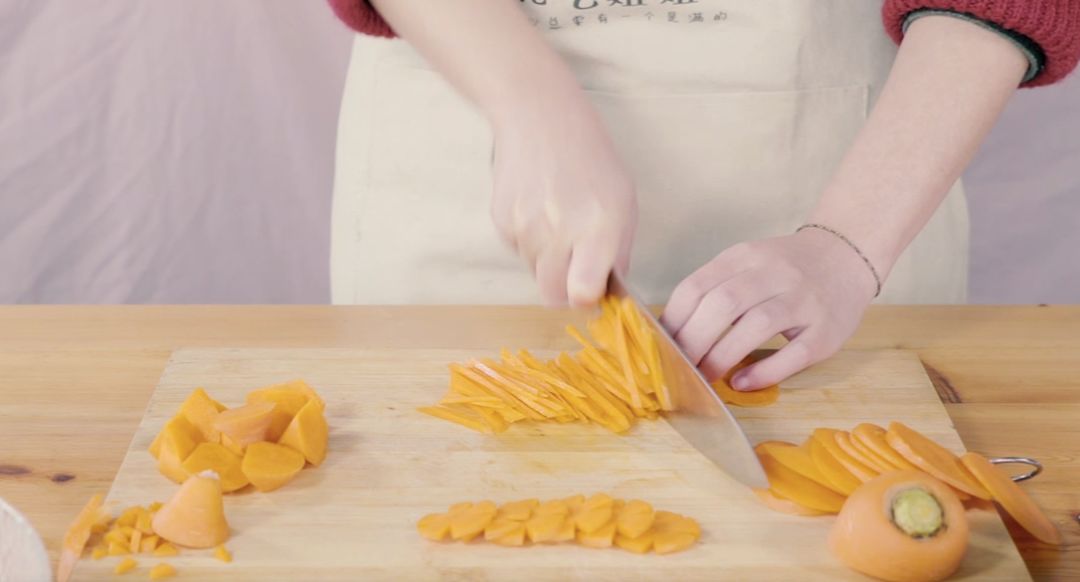 首先是胡萝卜,根据不同的菜式切成丝、片和块状,装进保鲜盒里,几天内可以用完就放冷藏,剩余的可以放冷冻储存。