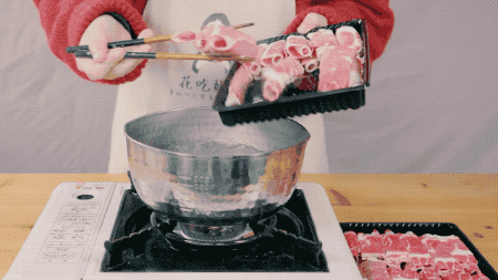 ▼ 1. 肥牛焯水:烧开一锅水,倒入肥牛片,变色就捞出。