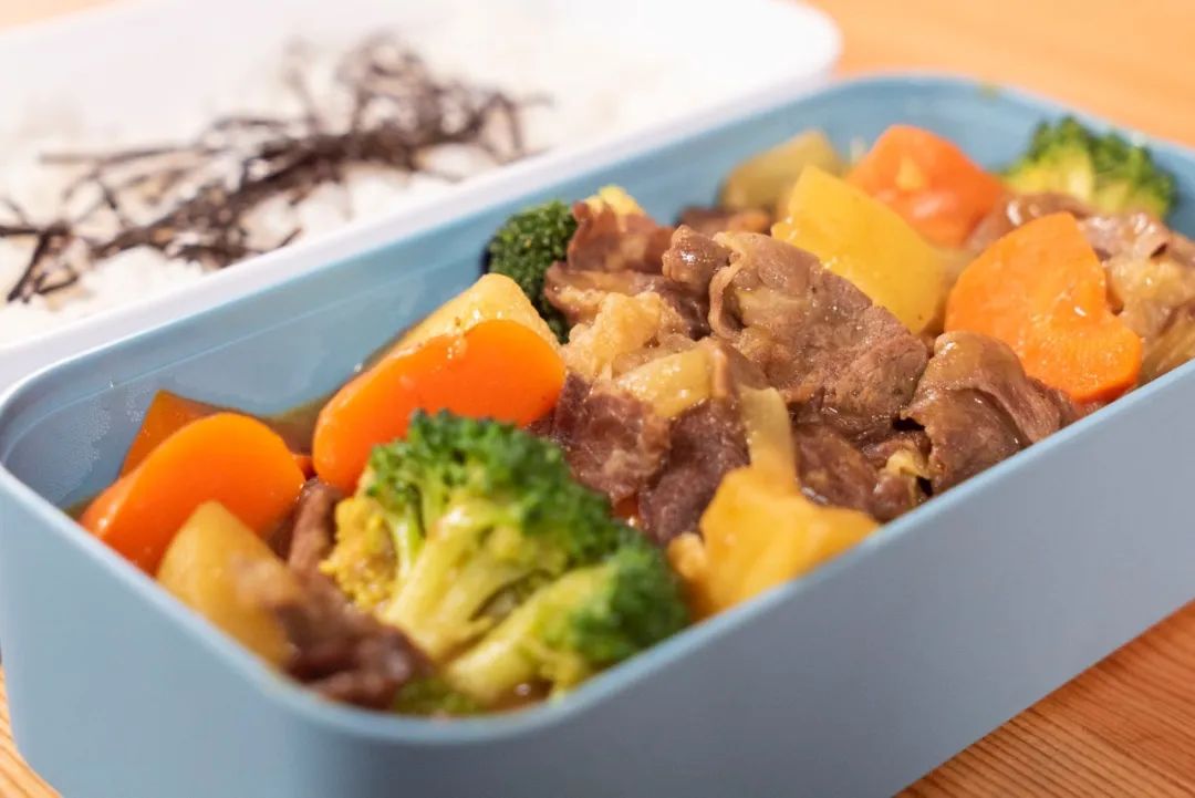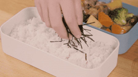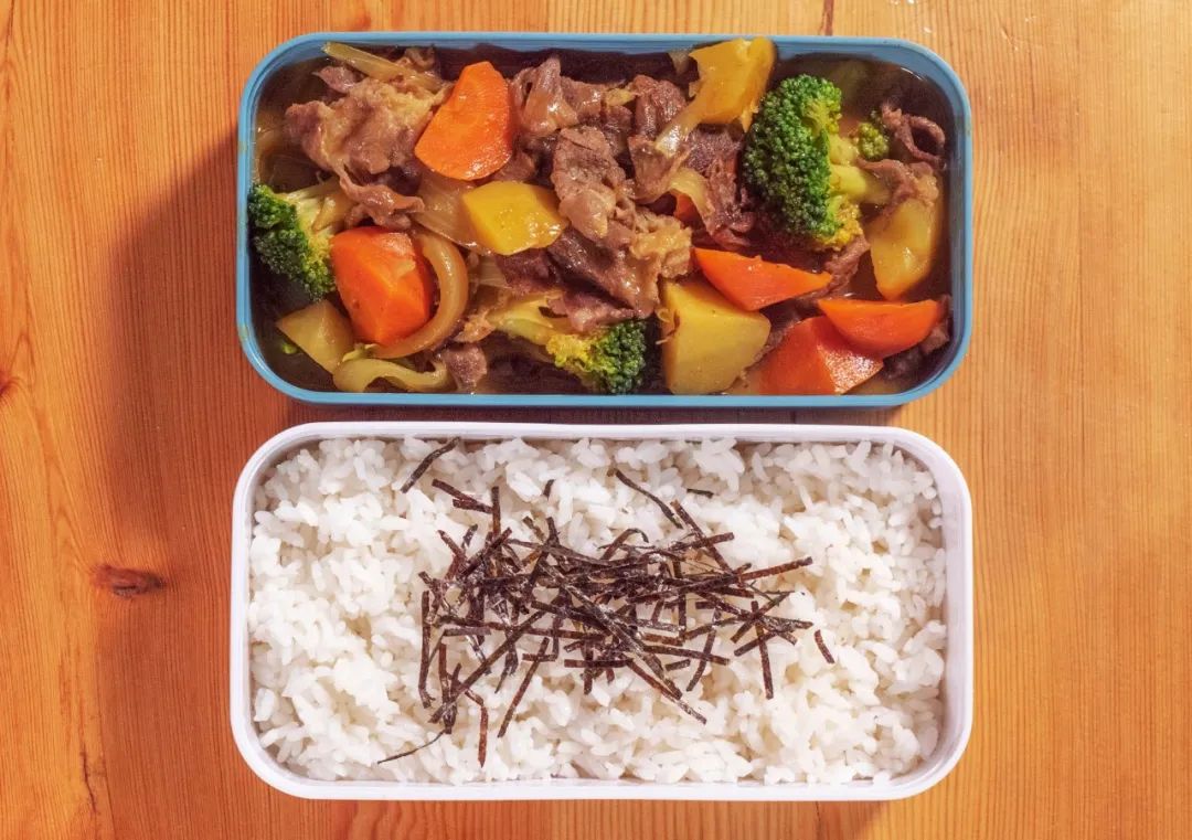 ▼ 5.组装便当:便当盒一层铺上满满的米饭,另一层舀上咖喱肥牛。