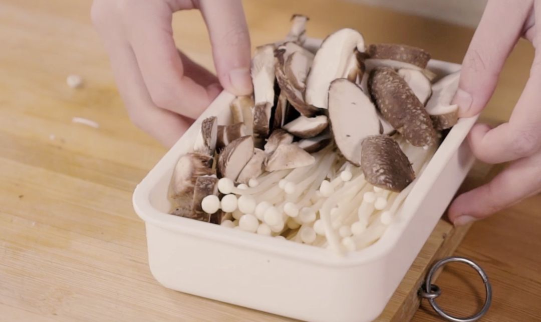 接着是菌菇类,香菇切片,金针菇切掉根部,装进保鲜盒里放冷藏。