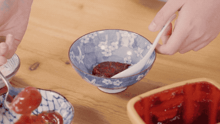 ▼ 1.调拌饭酱:拿一个小碗,把韩式辣酱、番茄酱和白砂糖拌匀。