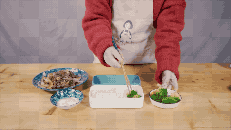 ▼ 5.组装便当:便当盒一层铺上满满的米饭,摆上西兰花和胡萝卜片。