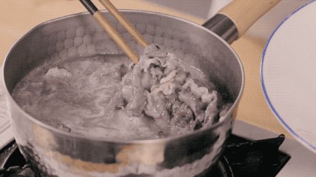 ▼ 3.处理肥牛:烧开一锅水,倒入肥牛片,煮到变色就马上捞出,沥干备用。