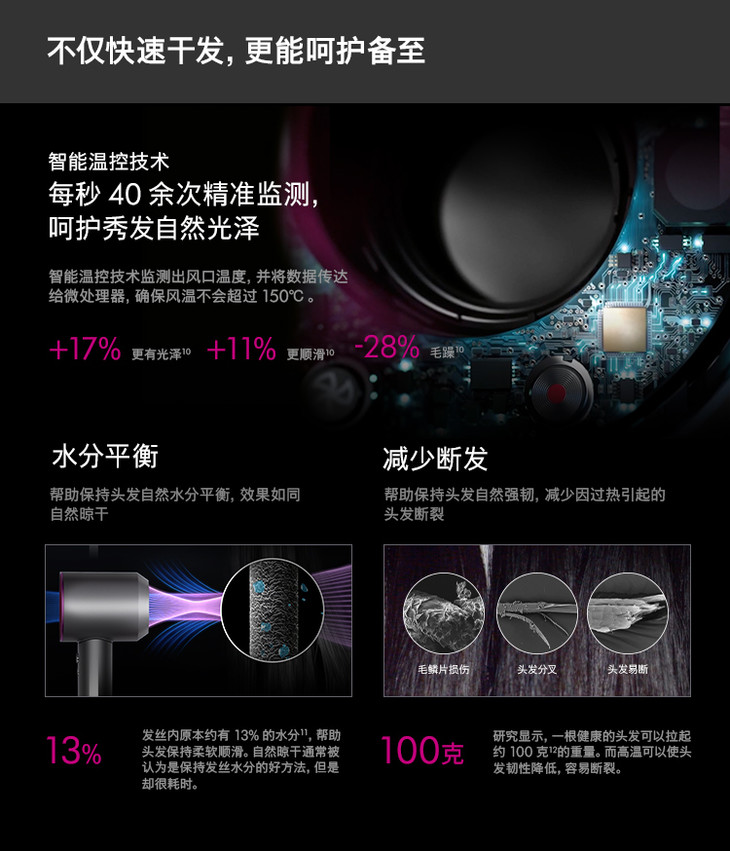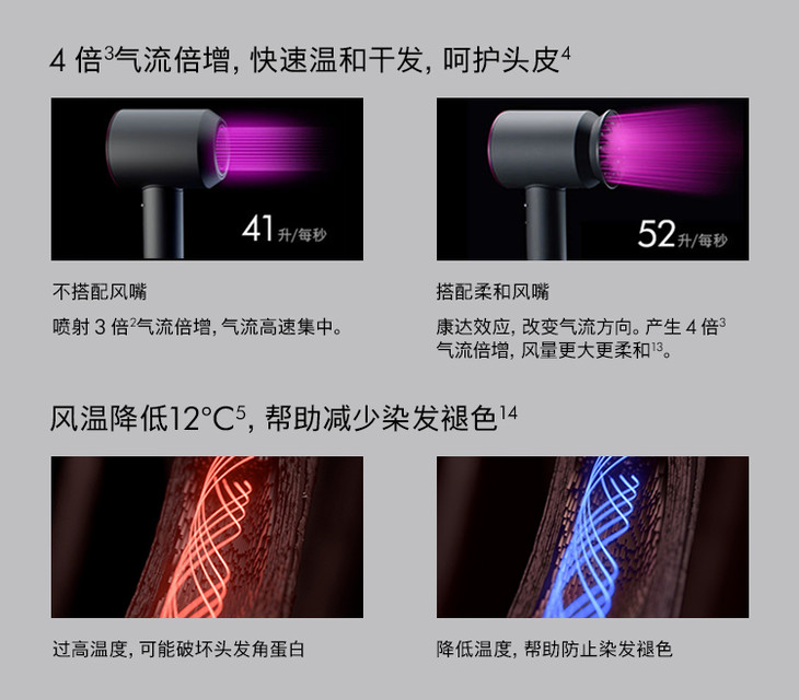 要特别夸夸它的“温度”。在吹干头发的过程中,哪怕静置一会,也不会感觉到烫,并且风力很柔和。