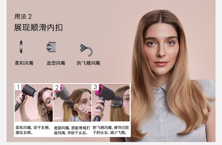 风力柔和,营造蓬松发型 热风档和冷风档根据季节搭配输出绝对不烫头皮,冬天吹,暖暖的很贴心。稳定吹出暖风,一年四季都适宜,十分柔和,给宝宝吹建议抵挡搭配调和适当的温度,就算是对着脸吹,也不会觉得过热,绝对安全。 一年四季都可以调节出适应的温度,夏天吹,犹如微风拂面,畅快舒适。 打造多种发型。
