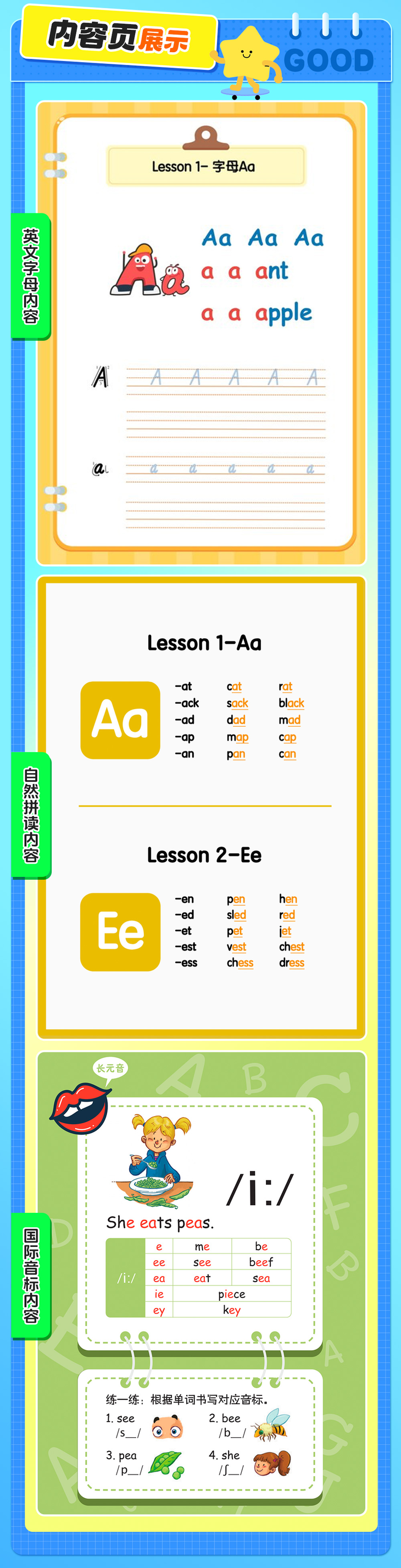 📚全方位内容覆盖:英文字母、自然拼读、国际音标、听说词汇、日常对话、分级阅读、英文歌谣、英文动画,让孩子从听、说、读、写四方面全面发展