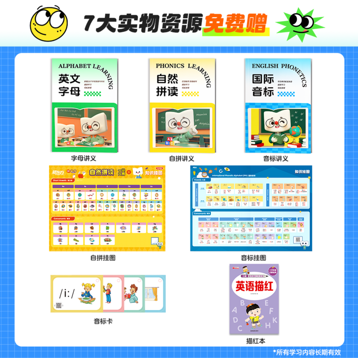 5、赠送7大实物随材:赠送3本精美讲义、自然拼读挂图、音标卡、音标挂图、英语描红本、课程激活卡💡