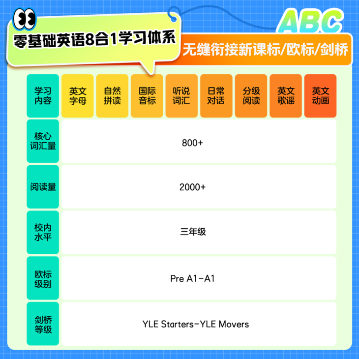 这是专为3-12岁孩子设计的一站式零基础英语启蒙课程,八大板块内容紧密衔接,全面提升英语能力: