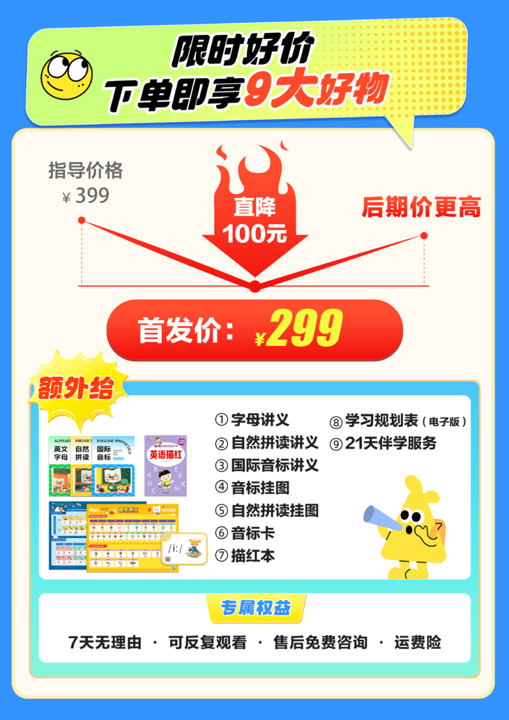市场价1592元的课程,现在首发仅299元!课程永久有效,还赠送7大实物,包含:3本精美讲义、自然拼读挂图、音标卡、音标挂图、英语描红本、课程激活卡