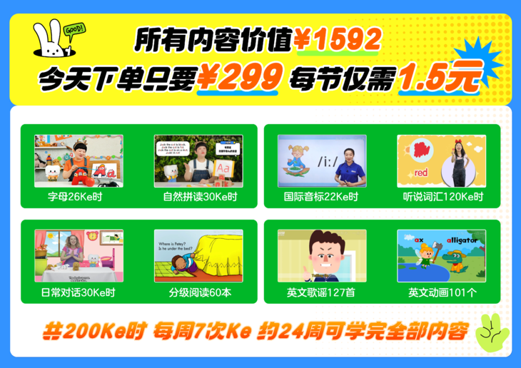 🎧丰富配套资源:228个课时,60本分级阅读,127首英文歌谣和101个趣味动画,约24周可全部学完