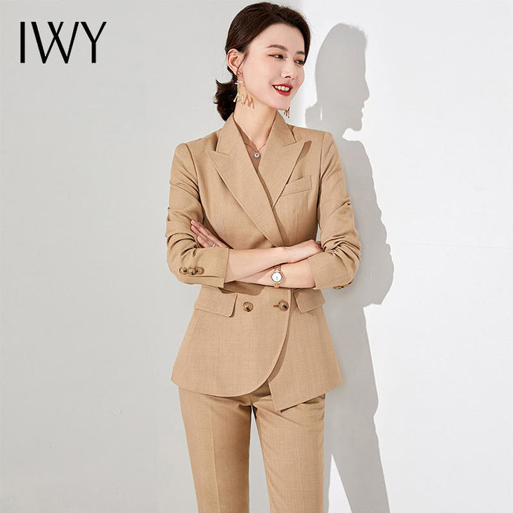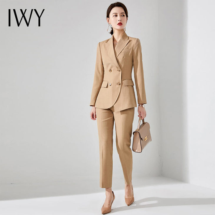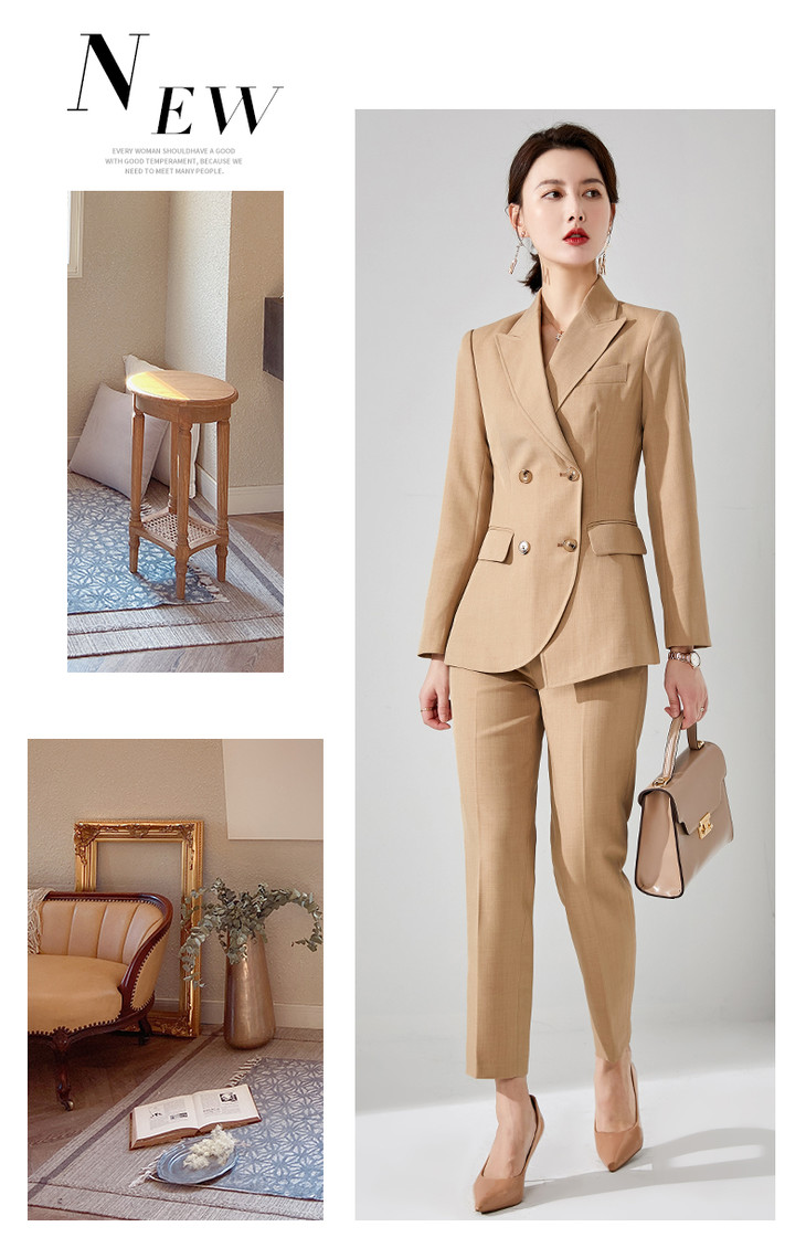 卡其色同黑色一样低调显高级,又比黑色多了一份清爽和温柔。枪驳领的设计完美凸显脖颈曲线,略微的垫肩让身形更挺拔。九分裤的长度精神利索,裤腿的高压线让腿型看起来又瘦又显直。