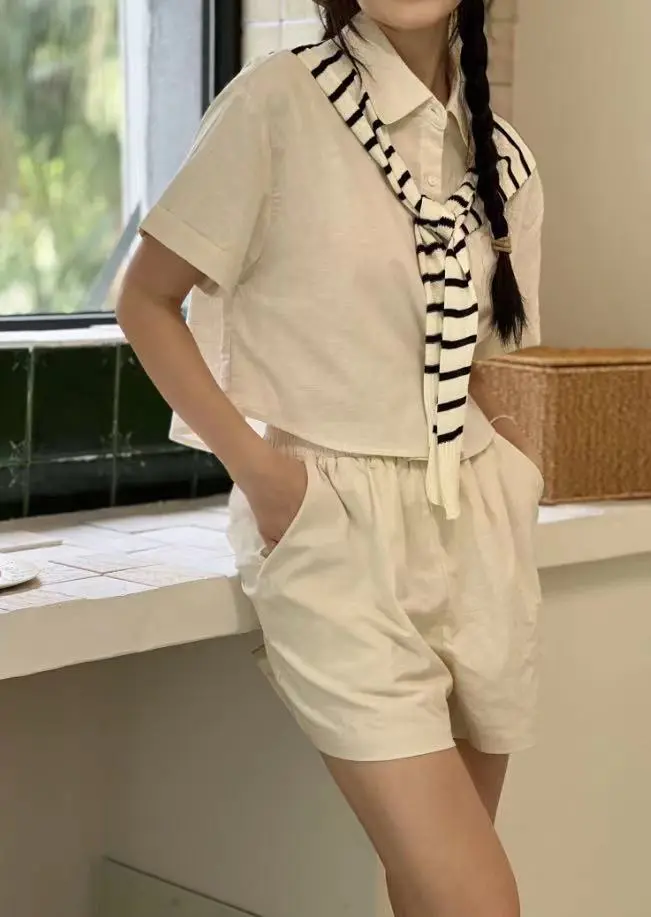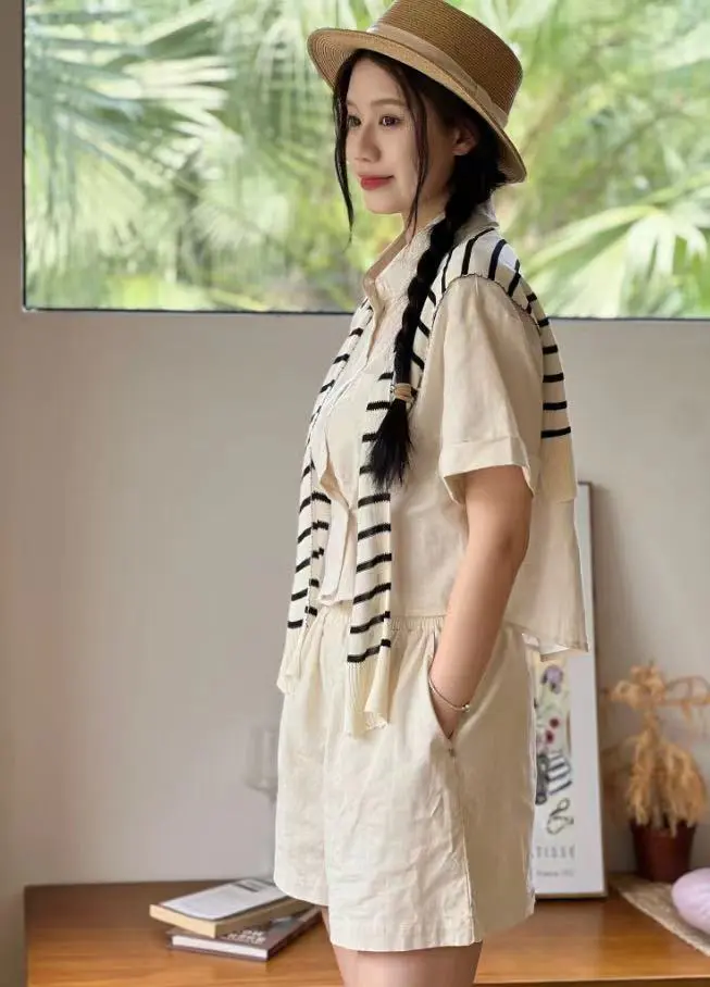 自然-亚麻一粒扣短裤