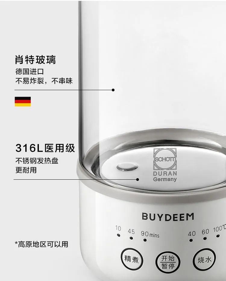 德国进口的肖特玻璃、比304更高级的316不锈钢、北鼎独家温控系统、简约却灵敏的按键······