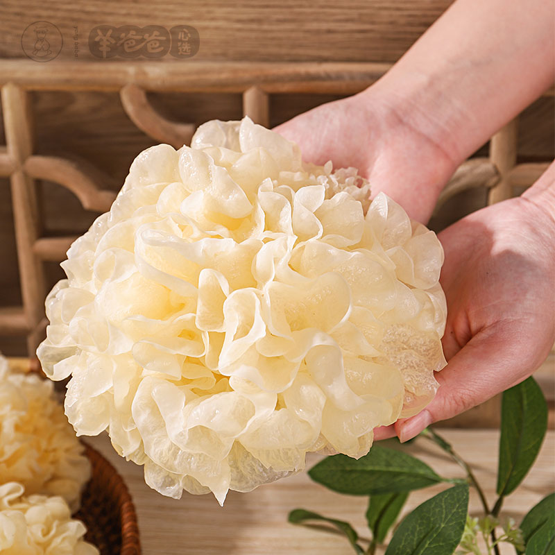 (点击图片可跳转寻味中国页面) 银耳,《中华本草》中记载,性味甘,淡,平;归肺,胃,肾经;能够补肺益气,养阴润燥。 羊爸爸心选古田银耳,是福建省古田县特产,中国国家地理标志产品。 古田县地处鹫峰山脉南端,溪谷相间,冬暖夏凉、雨水充沛、空气湿润、光照充足,春、夏、秋三季云遮雾绕,成为银耳生长发育的良好环境。 羊爸爸心选古田银耳,亮泽通透,没有小耳蕾,形似牡丹花或菊花,含有蛋白质、脂肪、碳水化合物、粗纤维、钙、磷、铁、钾、维生素B1、维生素B2、维生素D等,营养价值很高。