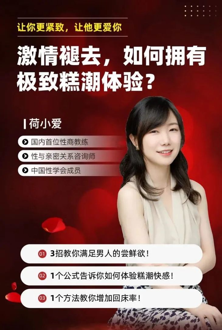 无xing生活给婚姻带来的伤害,远比大多数人想象的要严重。不少中年夫妻在婚后逐渐陷入“床上无xing,床下无话”的状态,从而两个人渐行渐远。就像我的闺蜜爱丽,婚后激情有所褪去,手机微信上,老公和兄弟的对话,字里行间尽是对爱丽深藏已久的不满和抱怨:——“在外头看来,她没法挑剔,但是回到家,躺床上就是一块木头,激不起任何欲望”爱丽看到后满是羞愤,不敢直面老公,只好找姐妹们诉苦。“他说过会爱我一辈子的,我为他付出那么多,为什么要这样对我?!”她问道:“你老公说你'不解风情',那你们关于‘那方面’是什么情况?”爱丽先是一愣,沉默半晌后说:“我们俩……的确很久没有亲热了。”她接着说:“自从大宝出生后,我对那方面的欲望就变少了。亲热时也感到干涩无力,自然能拒就拒,有时拒绝不了,也只能勉强配合……”晨姐叹了口气,说:“看来你俩的问题,不是不爱,而是缺乏高质量、有情趣的夫妻生活。福利二:抽奖送【夫·妻按·摩视频+两·性电影教程+性·感撩人视频教程】高质量、有情趣的夫妻生活,不仅会让男人对妻子更着迷,也会让女人享受到致命的愉悦。但和谐的xing生活,不是凭空得来的,需要不断训练和学习。夫妻生活从来都是老公主动,而且每次都是同一个姿势;偶尔老公有新想法,她也总是羞于配合。渐渐地,老公似乎对她越来越不感“xing趣”了,夫妻生活越来越少。还好后来遇到了性商教练荷小爱,收获了新的两xing认知,她还跟着荷小爱学到满满干货,从“根”上解决男人问题:福利二:抽奖送【夫·妻按·摩视频+两·性电影教程+性·感撩人视频教程】她是圈内小有名气的xing商教练,性与亲密关系咨询师 ,也是实战派情趣私教。她独创的“5感”训练法,迄今已成功帮助10000+学员,数千对情侣、夫妻双双奔赴爱河,有效改善亲密关系。其次,荷小爱不会给你灌心灵鸡汤,更多注重的是实操干货,帮更多人解决隐于启齿的xing事难题,让你学会就能直接用,甚至当晚就能见效。这一次,荷小爱老师带着一场免费福利直播,带给你更多“实战派”的情趣体验,让你从此告别松弛、无高巢、xing冷淡,重获紧致、润滑、甜蜜的愉悦生活!你想成为释放自我,会爱、敢爱、能爱、成为高xing商的幸福女人吗?