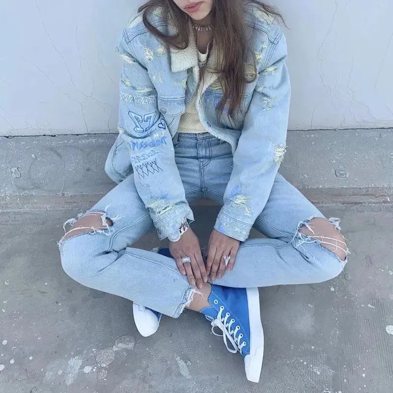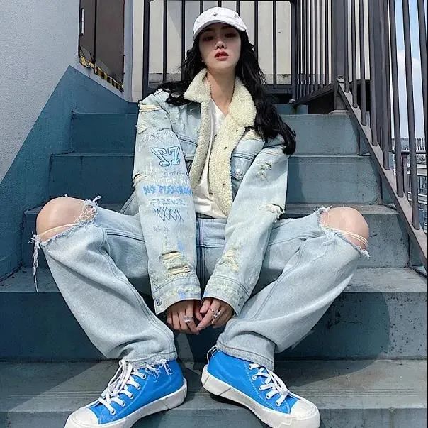这一款在破洞的基础上还做了一些手绘涂鸦的设计,内里还有薄绒,就南方来说感觉冬天穿这个也不会冷呢!