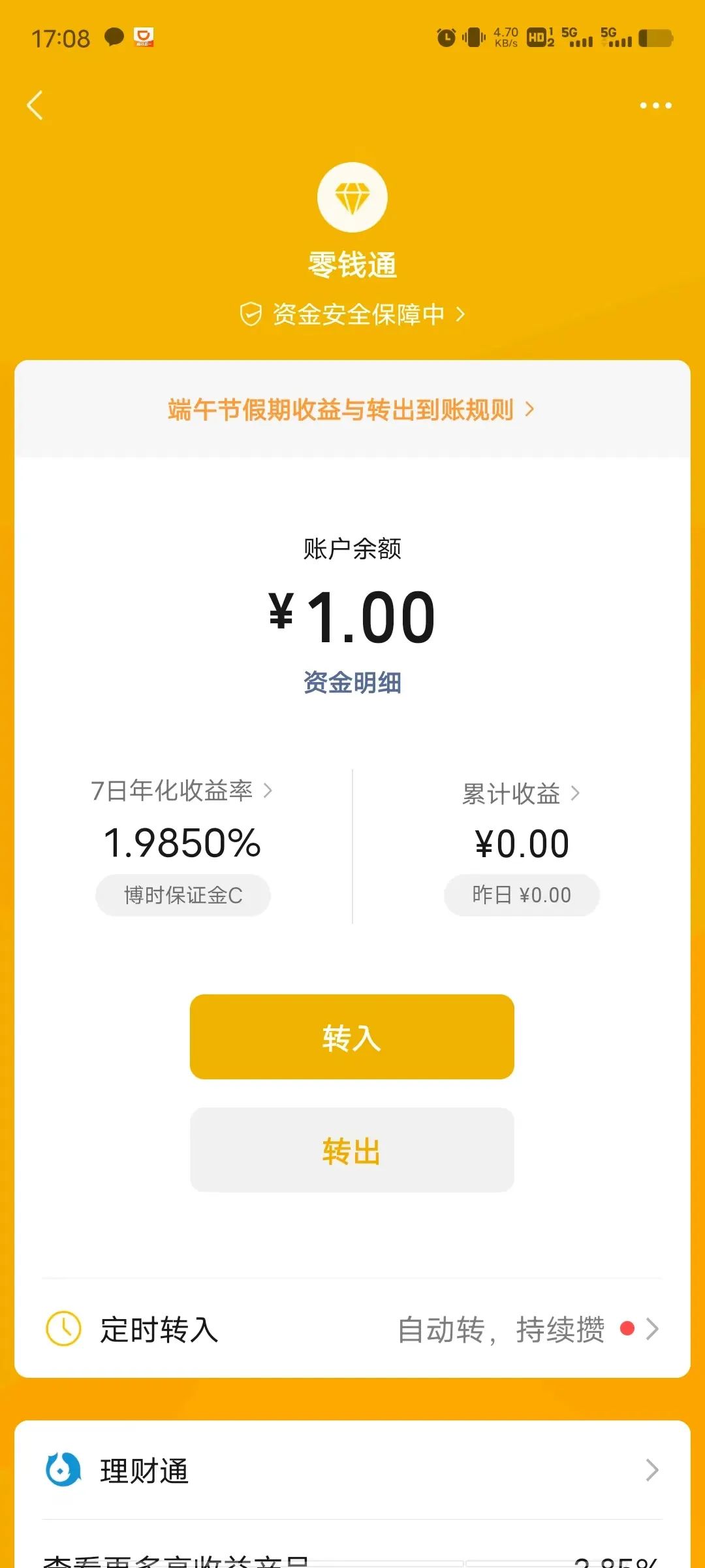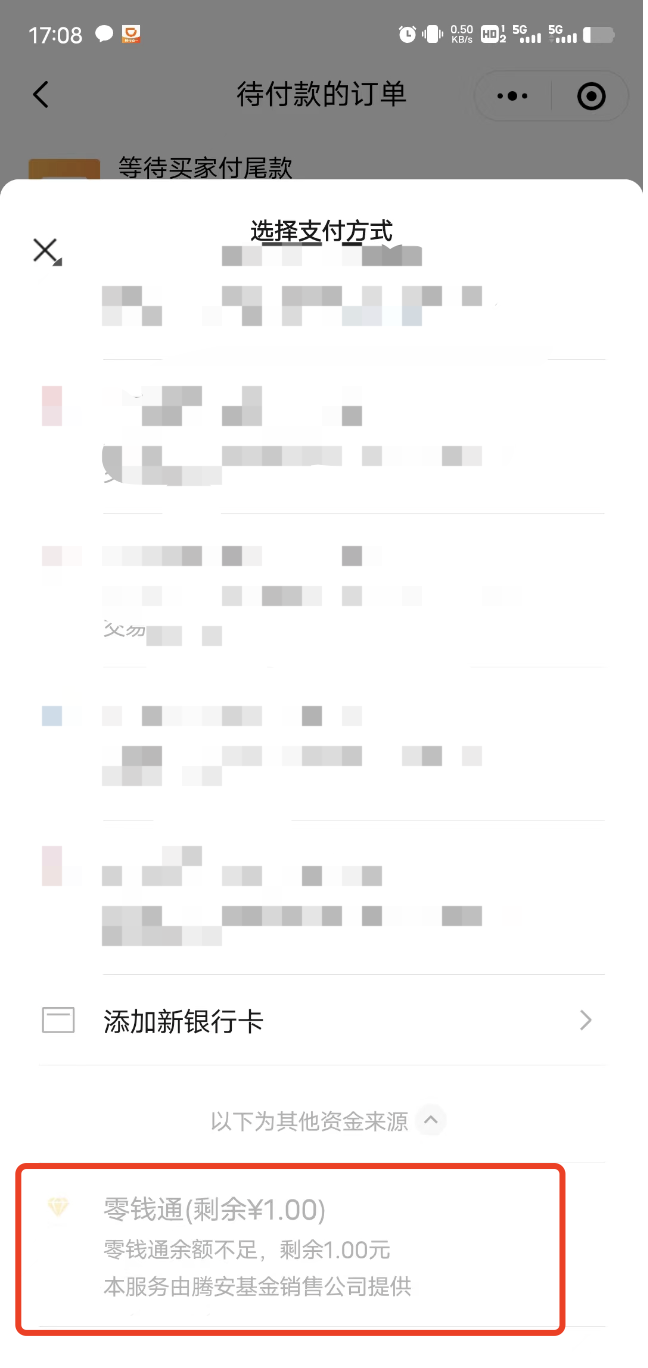 点击“转入”可以通过银行卡转入零钱,这时候支付尾款的时候,会自动出现“零钱通”的支付方式,通过零钱通支付。