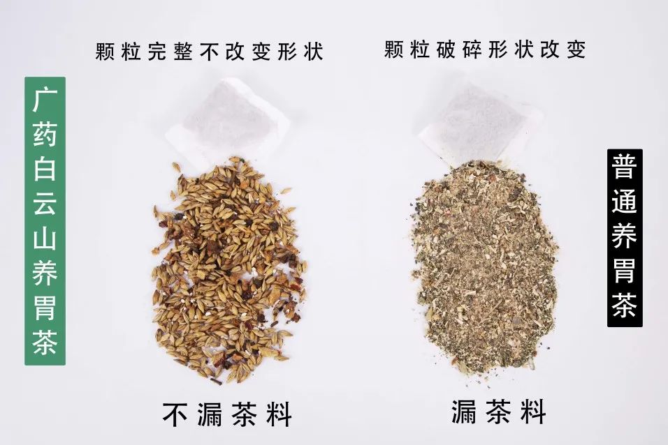 剪开普通养胃茶,里面都是碎渣材料,也不知道添加的都是什么,你肯定也不敢喝吧?还容易漏渣,喝起来口感也差!