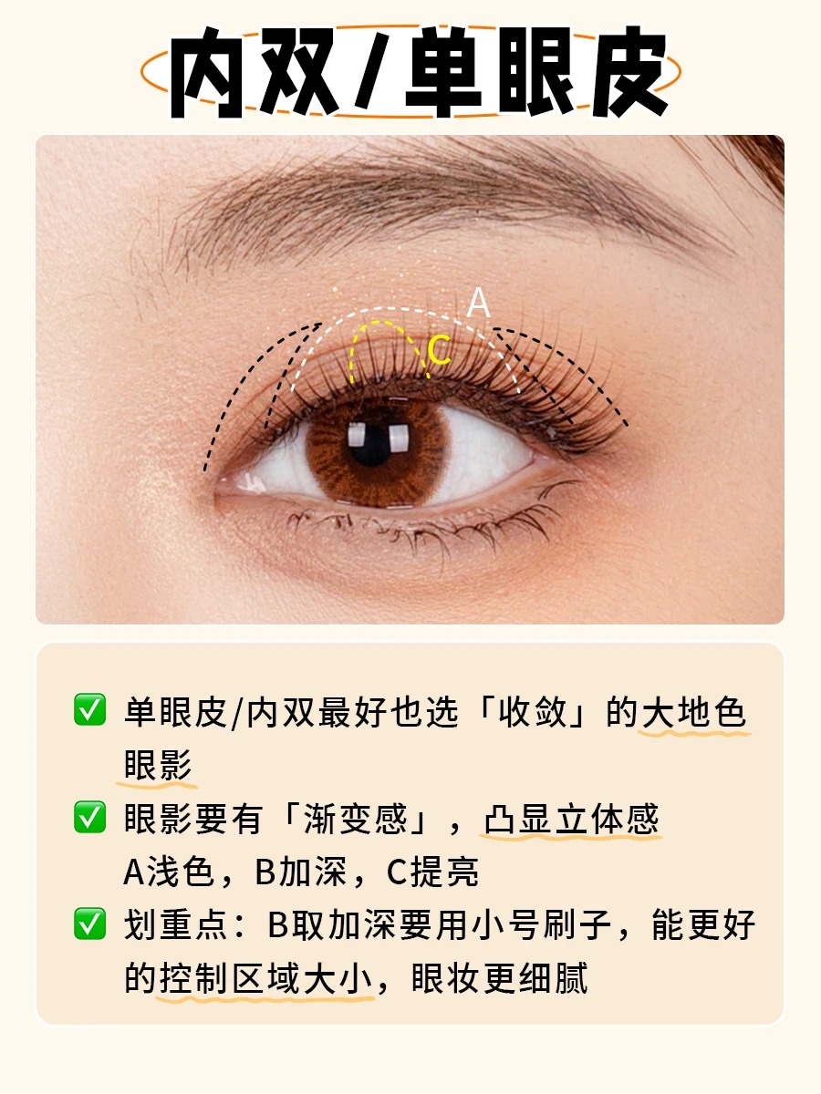 ✔️单眼皮/内双最好也选「收敛」的大地色眼影
