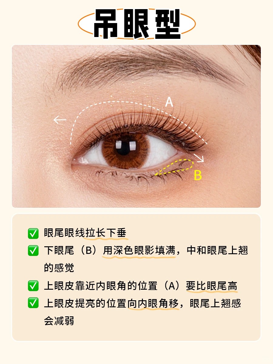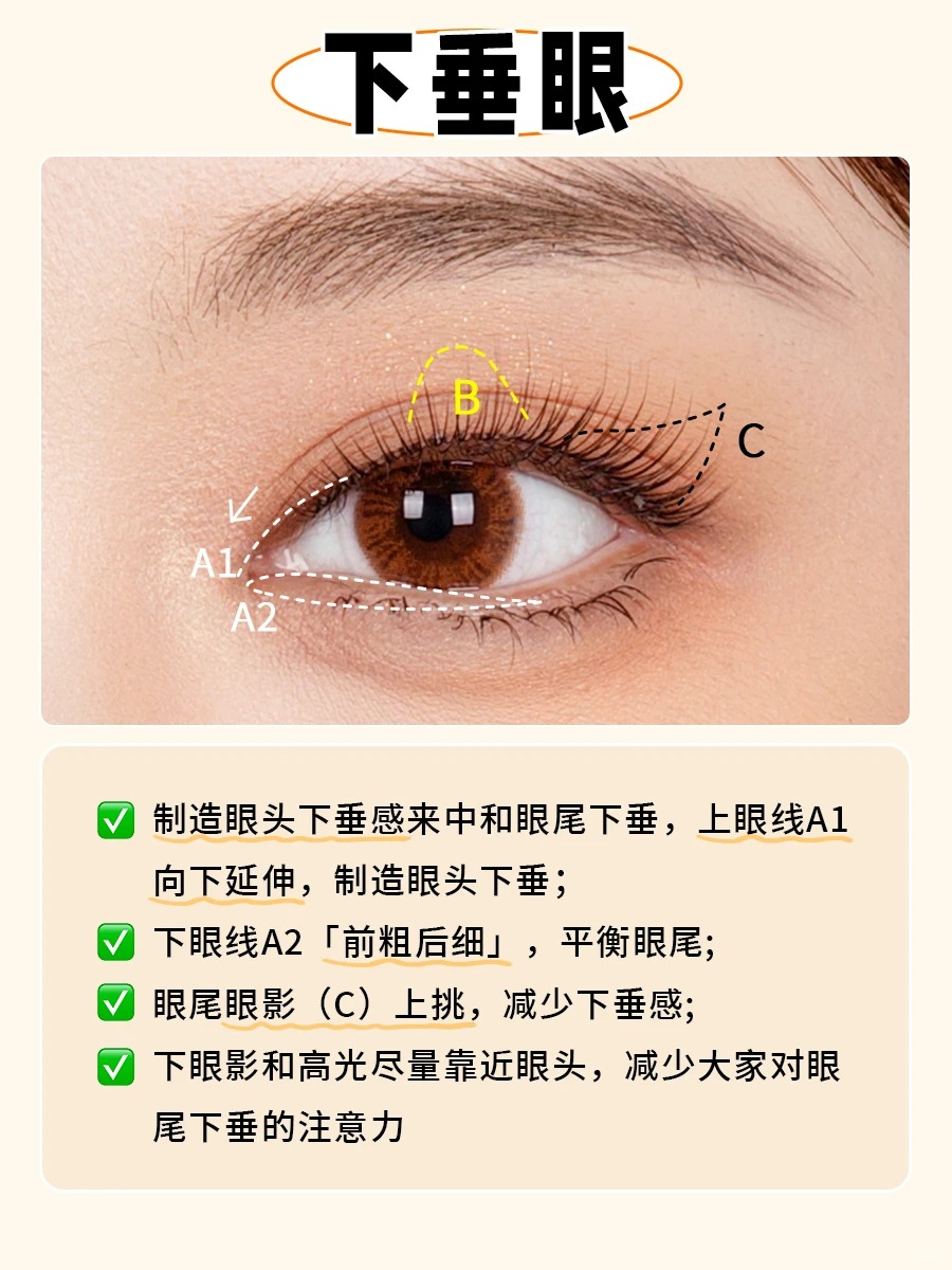 ✔️上眼皮靠近内眼角的位置(A)要比眼尾高