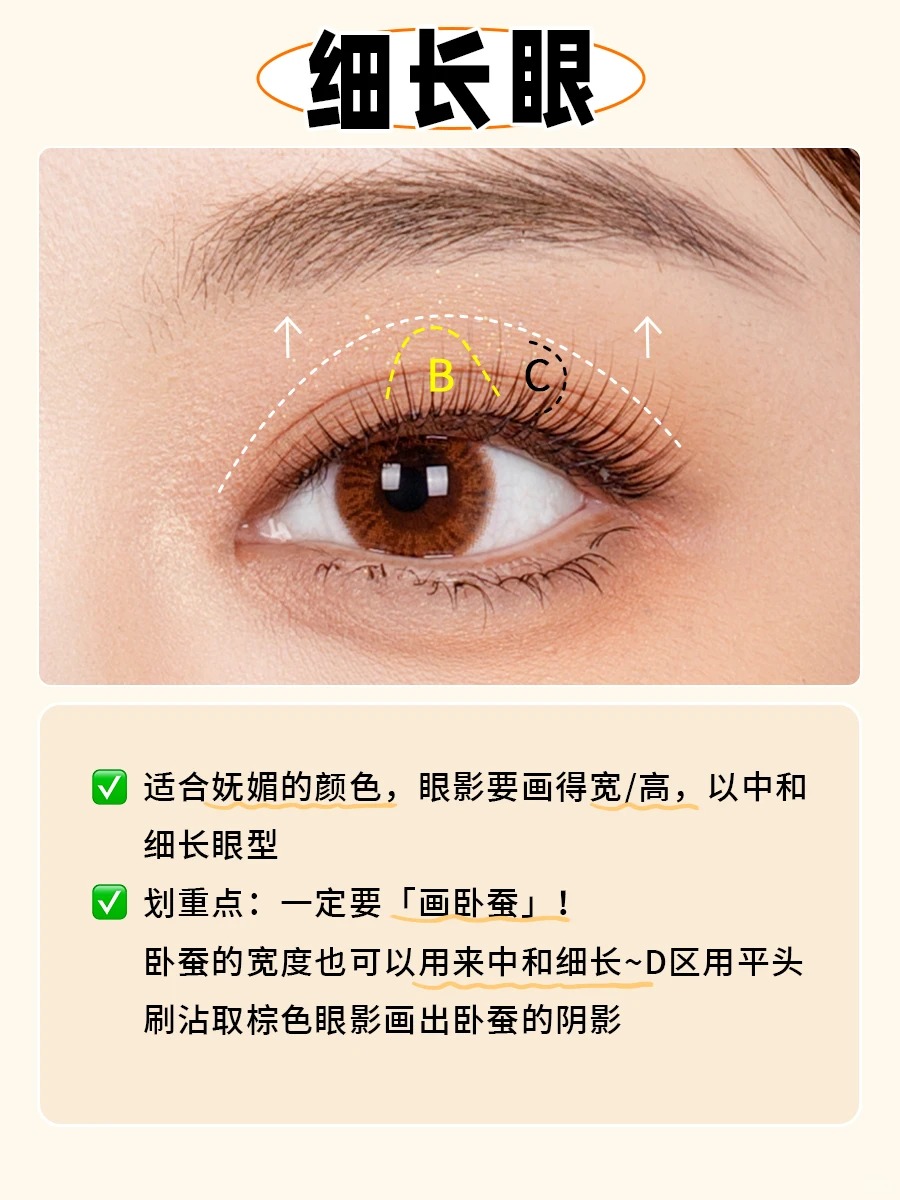 ✔️划重点:一定要「画卧蚕」!卧蚕的宽度也可以用来中和细长~D区用平头刷沾取棕色眼影画出卧蚕的阴影