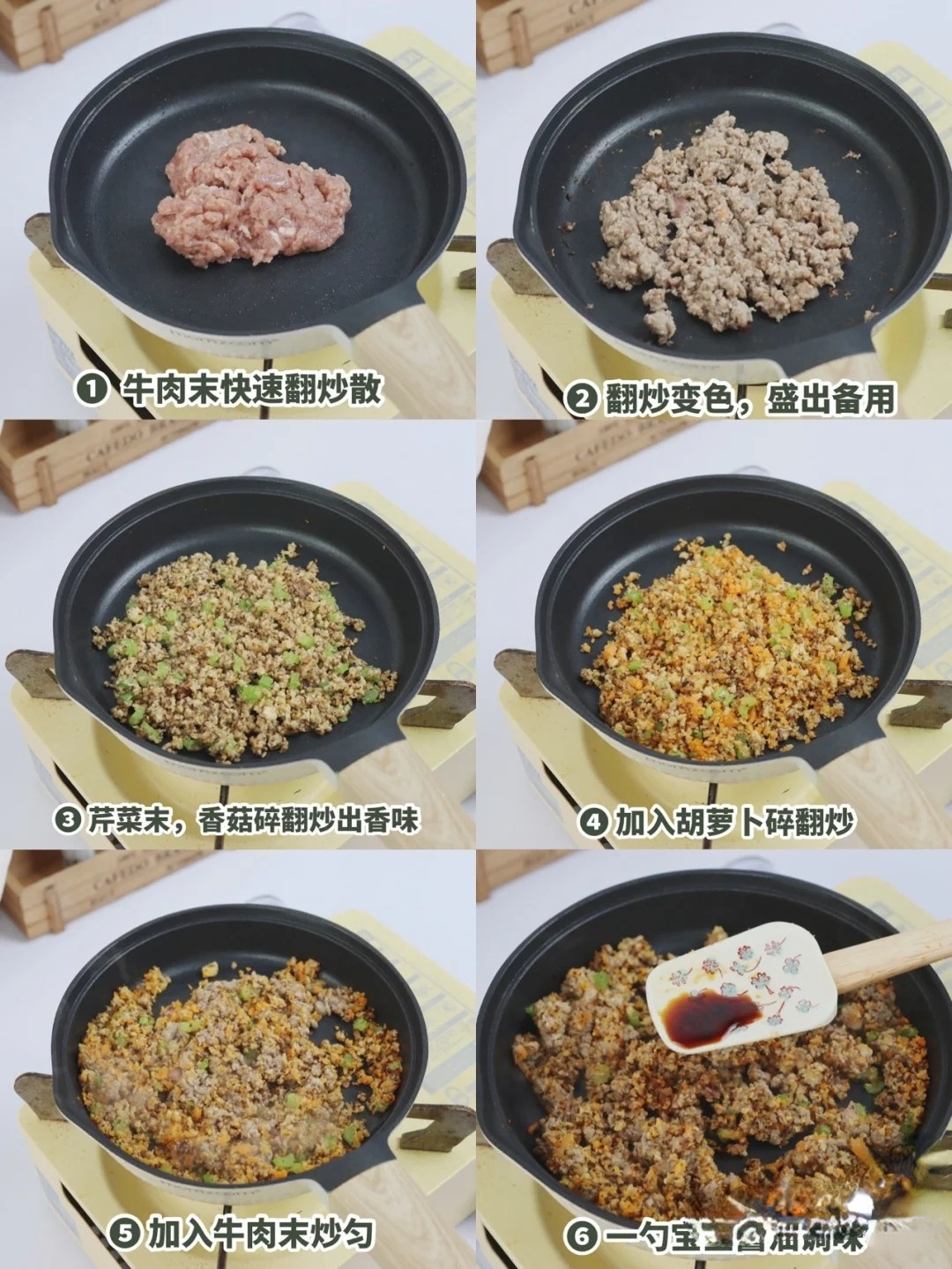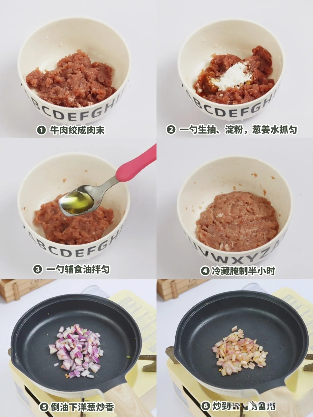 1、牛肉绞成肉末,加入一勺宝宝酱油,淀粉,葱姜水抓匀,再加入一勺辅食油拌匀,冷藏半小时腌制。