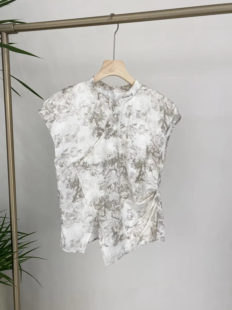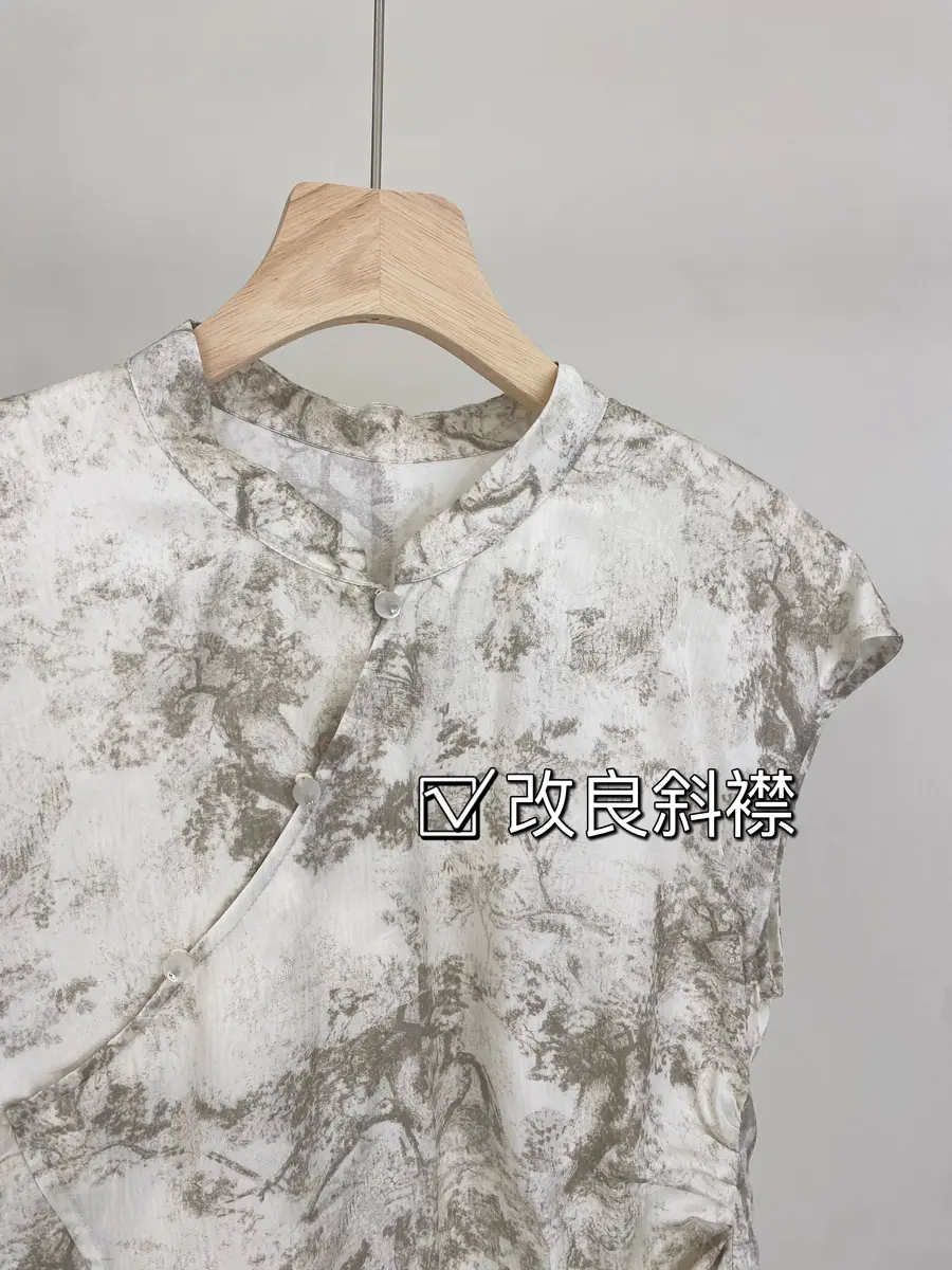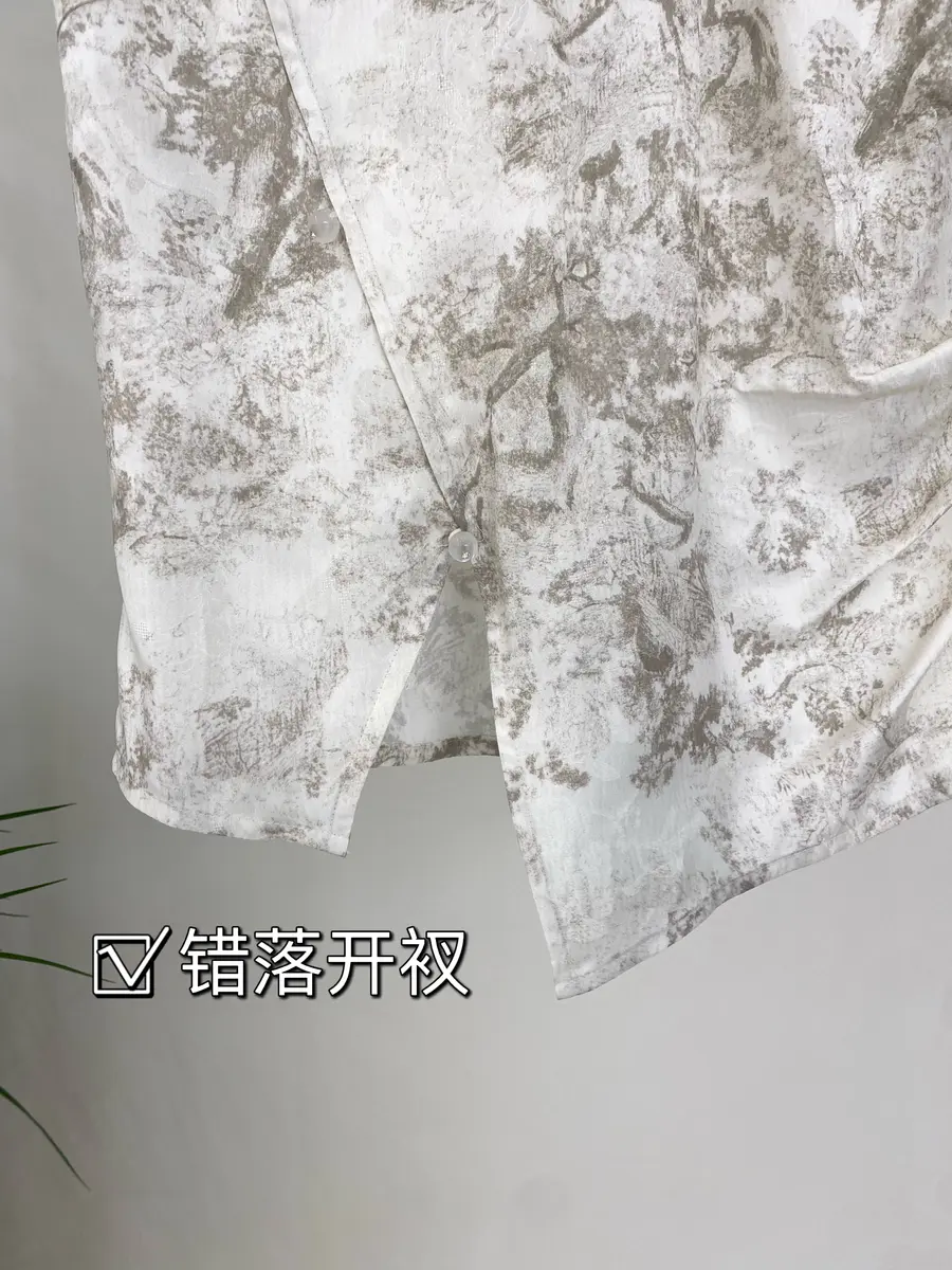 本期真丝系列唯一一款新中式小衫,有点脏脏色系感的晕染印花,非常别致有特色;