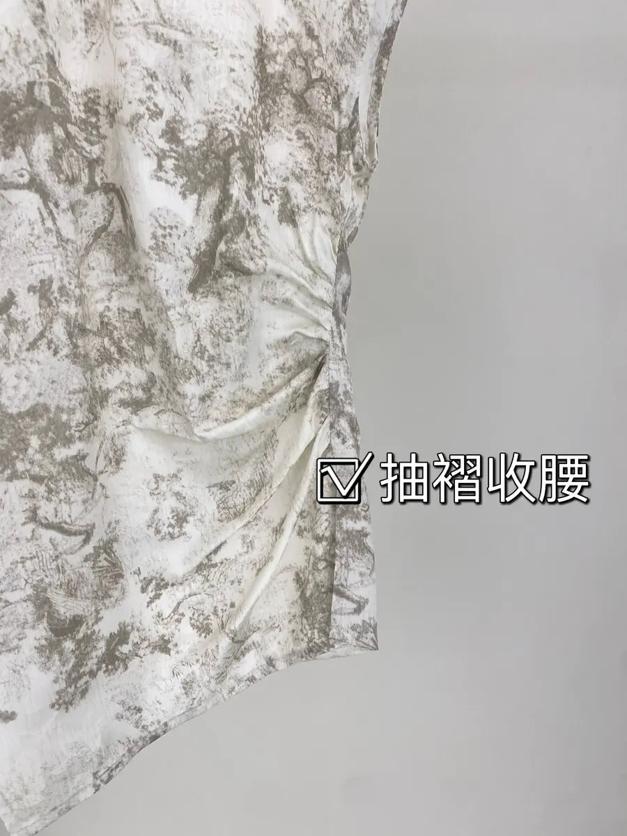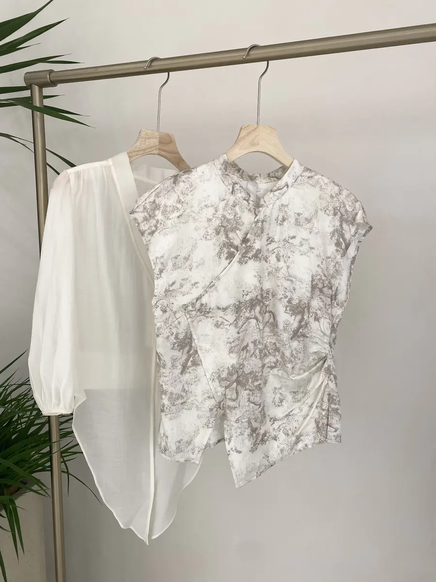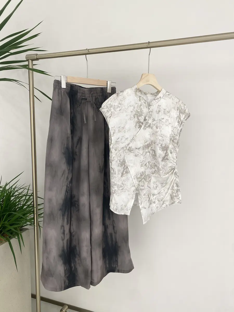 本期真丝系列唯一一款新中式小衫,有点脏脏色系感的晕染印花,非常别致有特色;