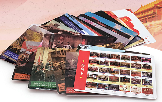 游戏玩法:圈内有30张卡片,卡片上是100年来的大事件,挑战的时候,卡片反面朝上,你们的任务是:在遵守规则的前提下,在100秒内,按时间线对100年光辉历程中的大事件进行排序。
