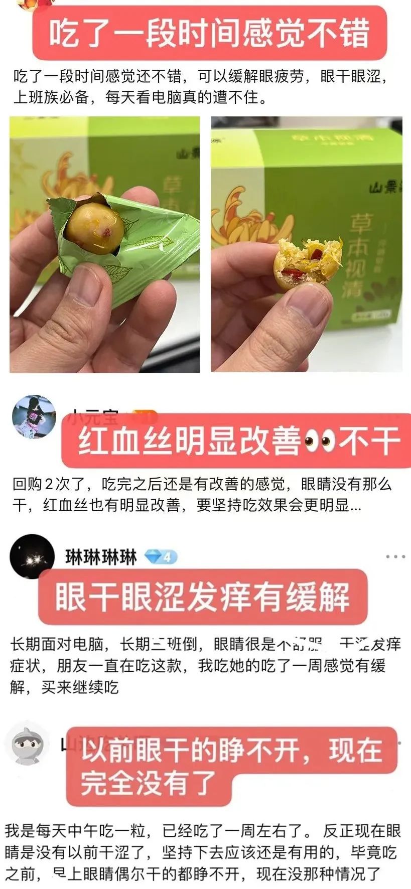 作为小编,经常熬夜加班,过度用眼,眼睛特不舒服,睡觉也休息不过来。同事建议我吃了一款“小丸子”,说里面全是对眼睛好的草本,没想到我就吃了不到一个月,眼睛那种干涩、酸胀感慢慢减弱了,眼睛里的血丝也都基本消退了!