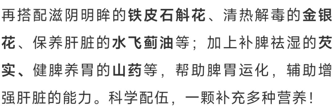 所以,明亮双眸还得从肝入手。而给大家介绍的这个“小丸子”由葛根、红枸杞、金丝皇菊、叶黄素酯、铁皮石斛花、金银花、淡竹叶、决明子、茯苓、山药、水飞蓟油等配伍而成,每一样都是清肝明眸、呵护双眼的好手,原料的配比也大有来头!
