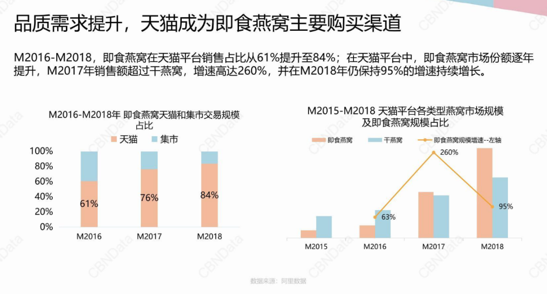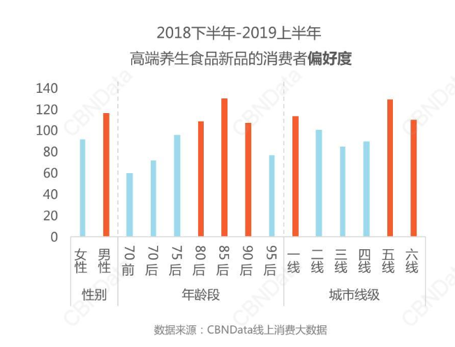 随着健康意识的增强,人们在健康养生方面越来越舍得花钱。根据CBNData《养生食品行业新品趋势白皮书》,阿胶、人参、燕窝等高端养生食品在养生市场占据颇大份额,尤其受到一线和五六线城市的80/90后欢迎,男性的消费潜力也有待发掘。