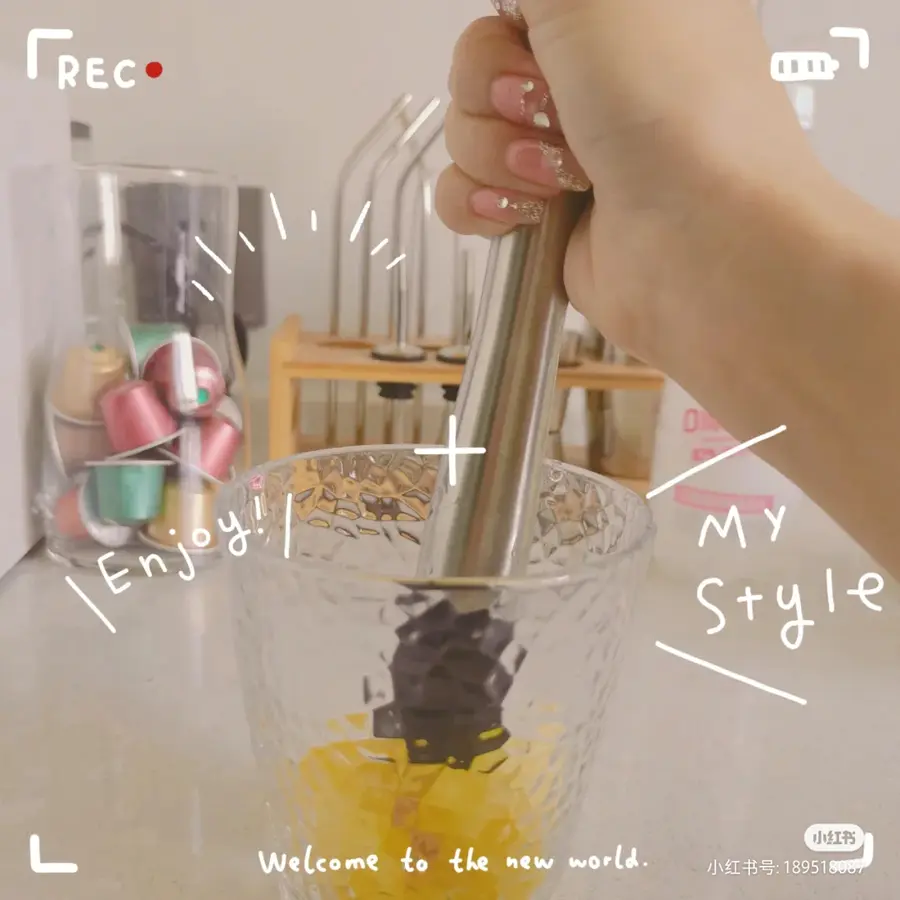 第一步,切块凤梨杯里倒,加不要钱的冰块儿捣起来