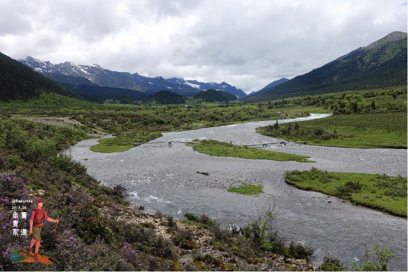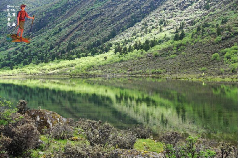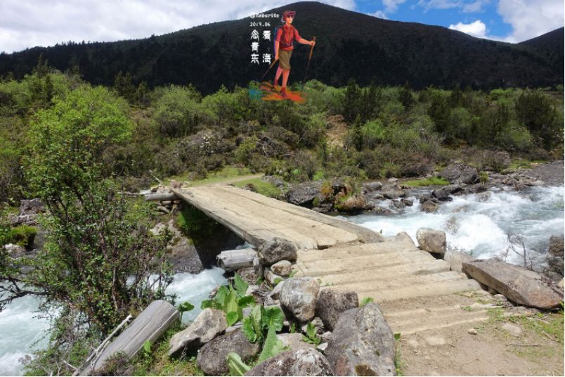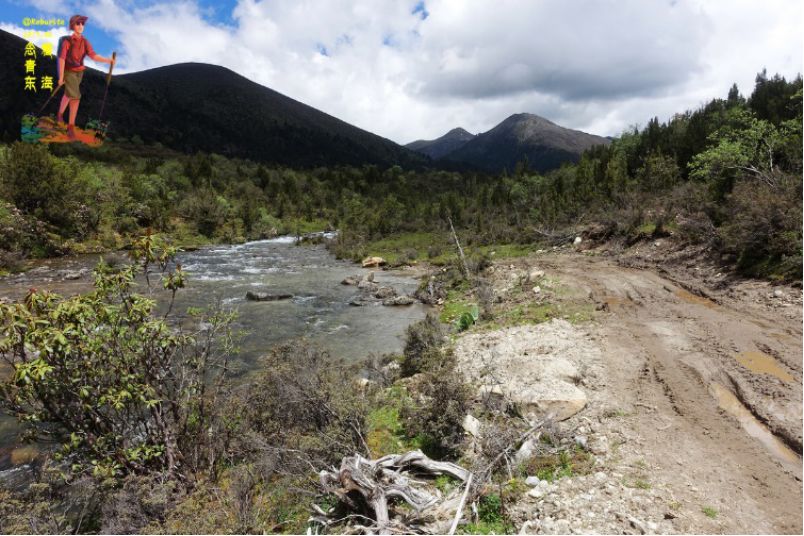 此处过桥和不过桥都可以走,在大约1公里后汇合。过桥后应该是全程机耕路,还会经过一个小海子:麦炯阿拉措。不过桥的路短一些,需要穿树林、走草坡,偶有积水的沼泽地,还有部分路段的路迹不明显,难走一些,估计比走过桥后的机耕路要多花约半小时。