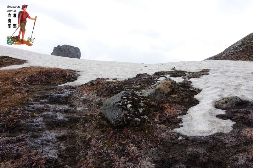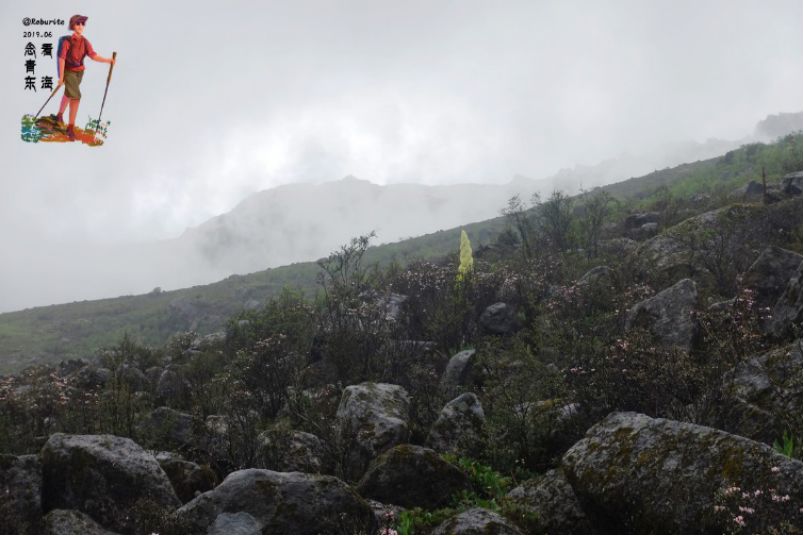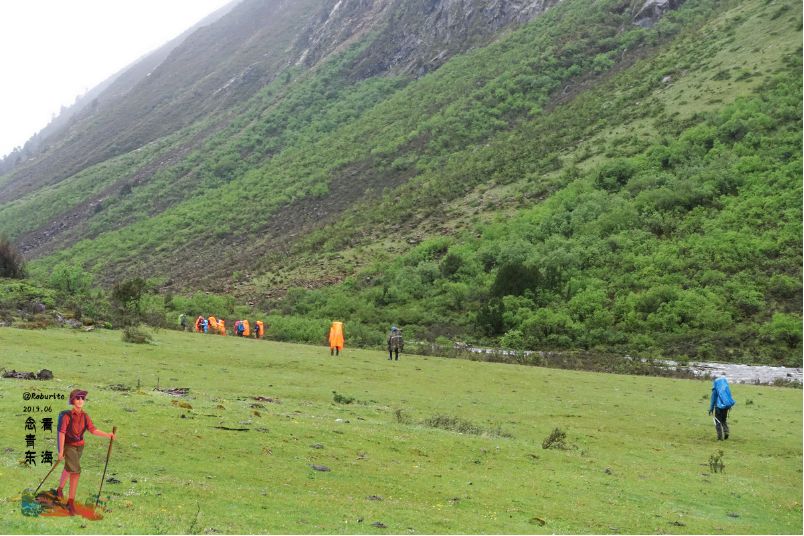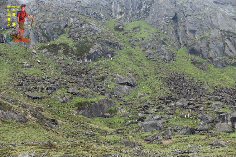 小木屋屋顶有好几处位置漏雨,火塘里没烧完的木头都是湿的。去门口观察雨是否变小时恰好看到佚名和老闲的队伍经过,他们是刚翻黑力垭口过来。