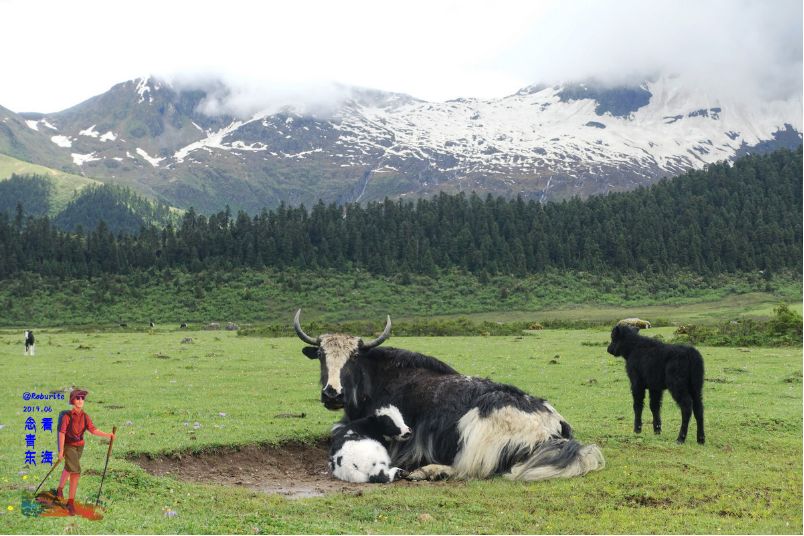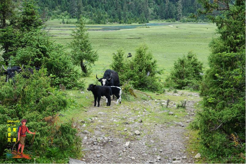 沿途经过了几个牧场,小牛犊跑来跑去,远看像是狗。依然有牦牛过来围观,我特意逗了下它们,用一只脚往后作刨土状,摆出准备进攻的姿态,牦牛就被吓跑了。也有牦牛很淡定,懒得搭理路过的人。