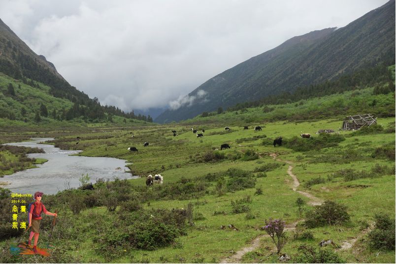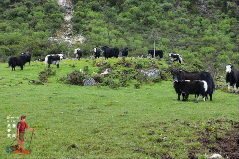 走到黑力措尽头,继续往前走一段路后到了一块相对平坦的草地。这里有很多牦牛,看到有人过来就有几只胆大的家伙走过来围观。