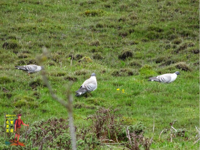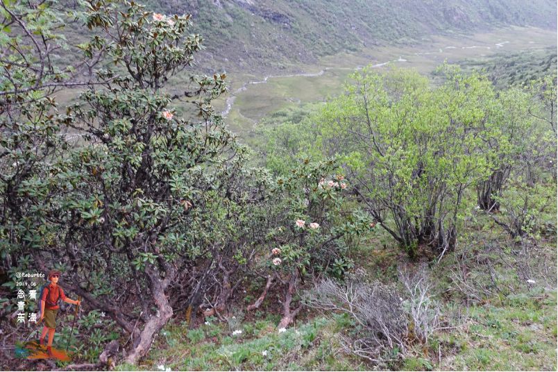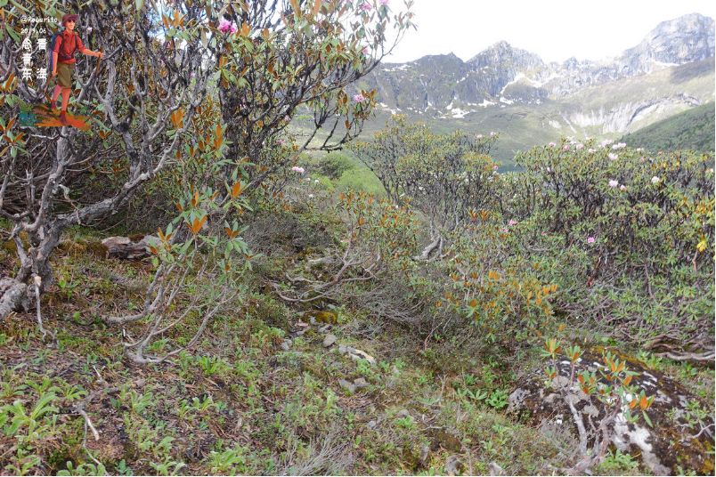 之后沿着湖边走了一会儿,折向北边强穿树林,与轨迹上的牧道汇合。路旁有很多杜鹃树。